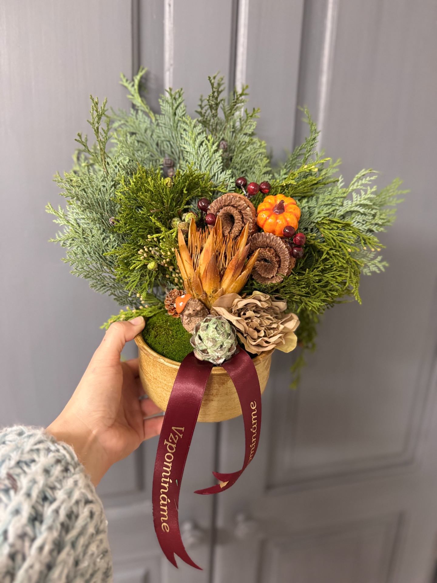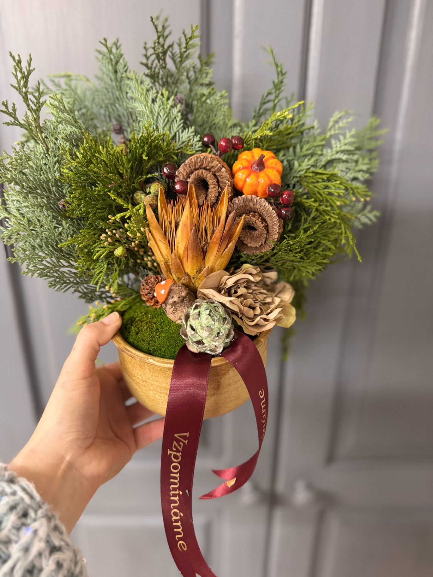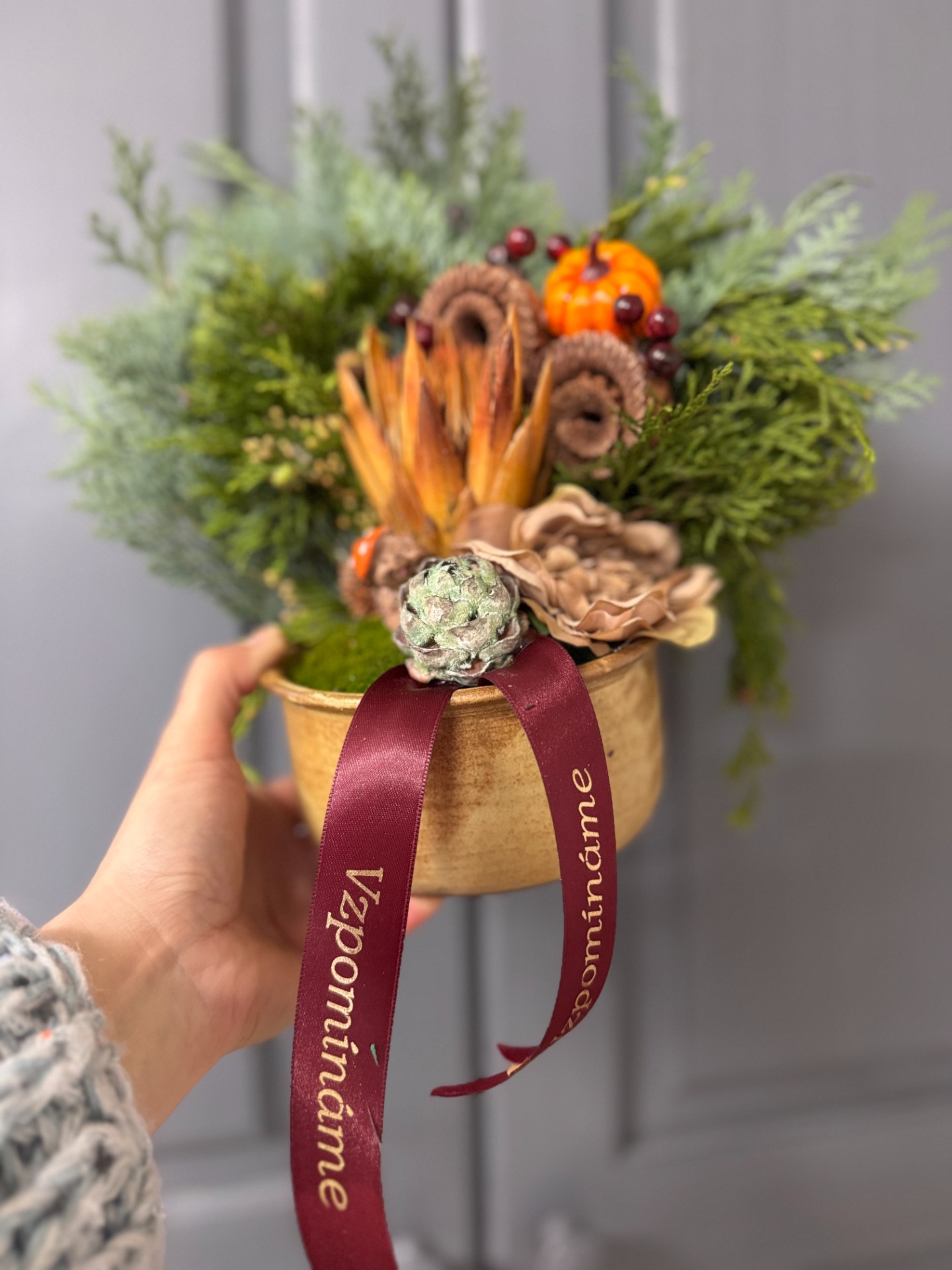 Decentní vzpomínkové aranžmá v keramické misce laděné do přírodních tónů. Kombinace zeleně, sušených plodů, stabilizovaného mechu a jemných doplňků vytváří harmonický celek plný klidu a úcty. Díky své velikosti se hodí i na menší hrobová místa nebo jako drobná památeční dekorace.