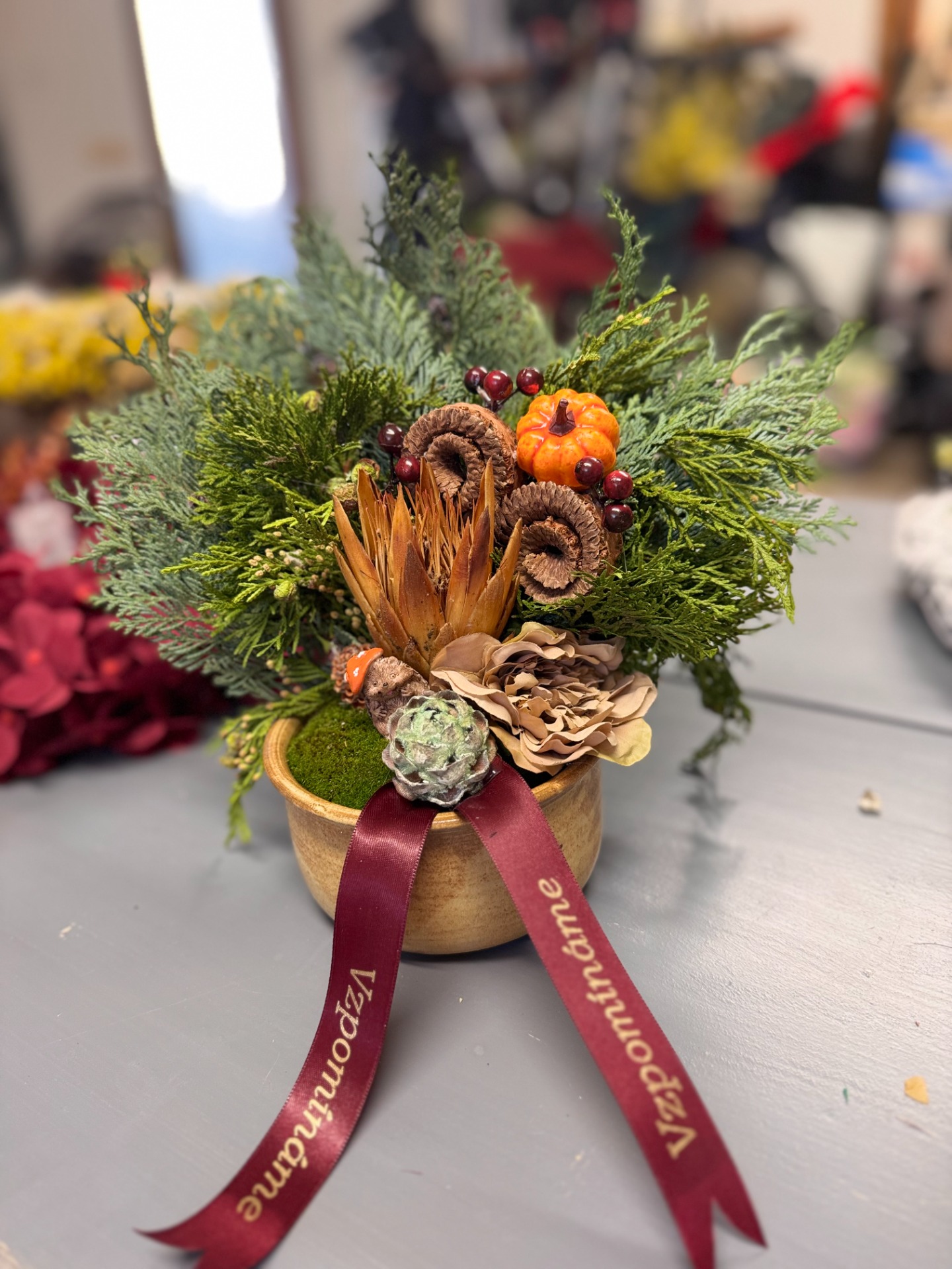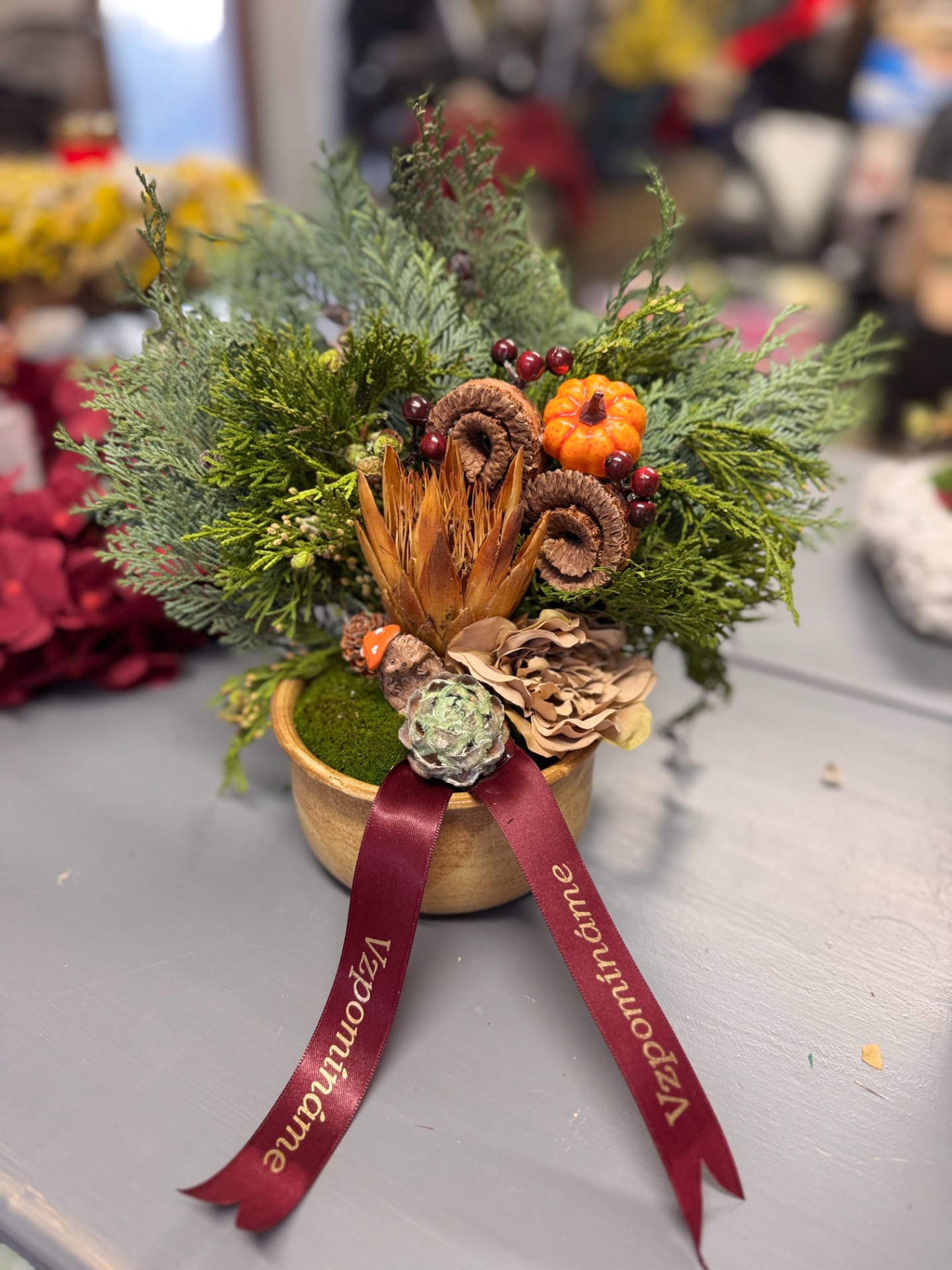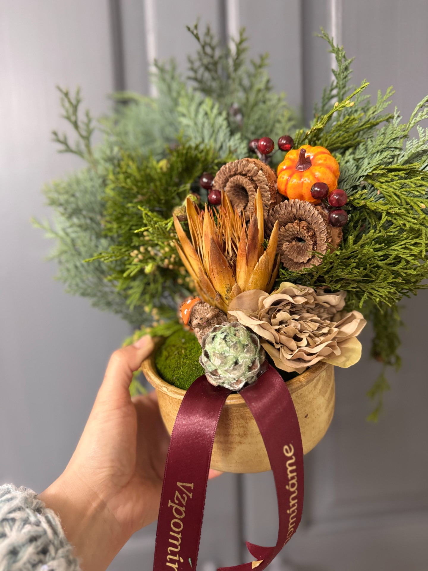 Decentní vzpomínkové aranžmá v keramické misce laděné do přírodních tónů. Kombinace zeleně, sušených plodů, stabilizovaného mechu a jemných doplňků vytváří harmonický celek plný klidu a úcty. Díky své velikosti se hodí i na menší hrobová místa nebo jako drobná památeční dekorace.
