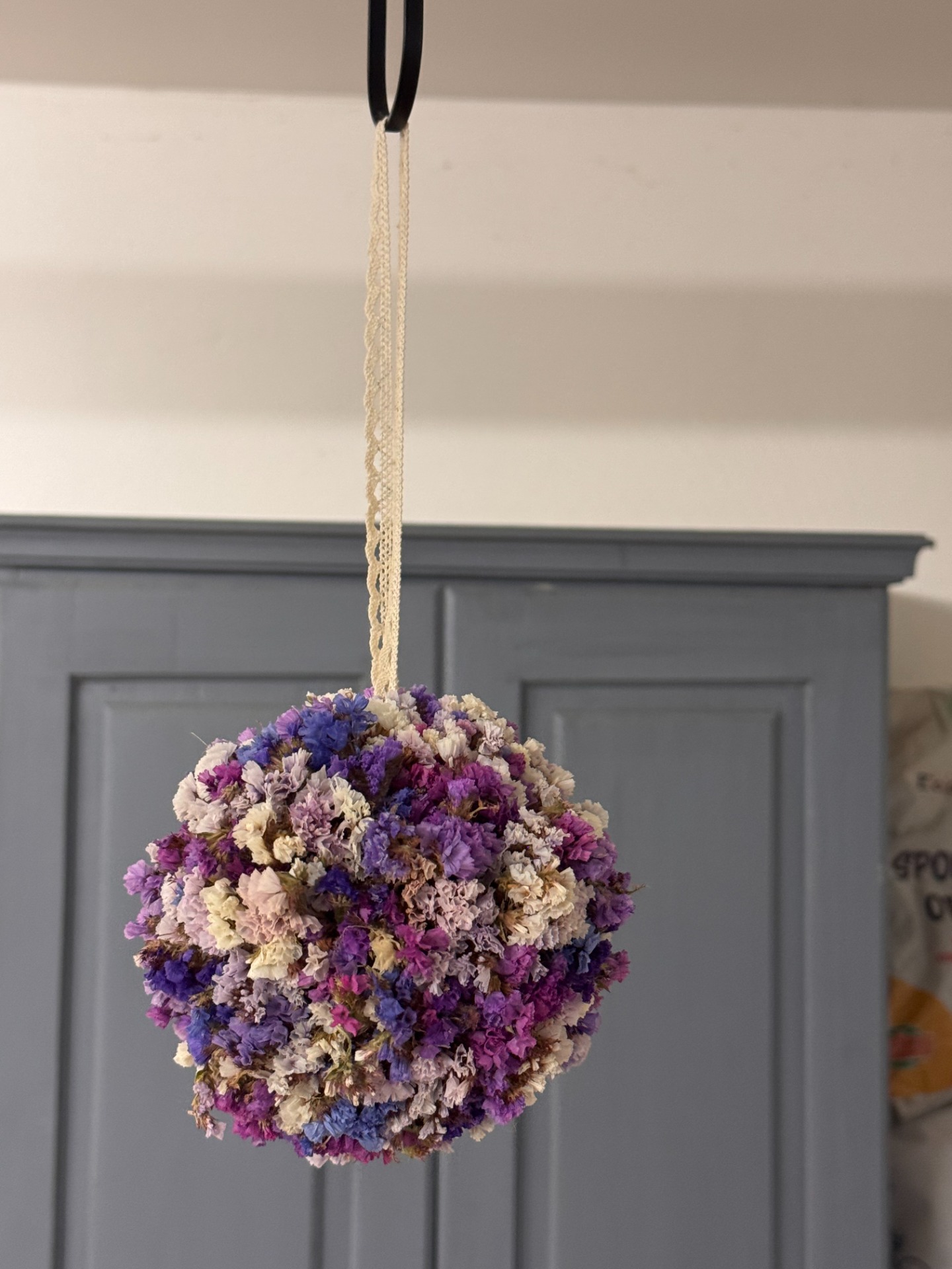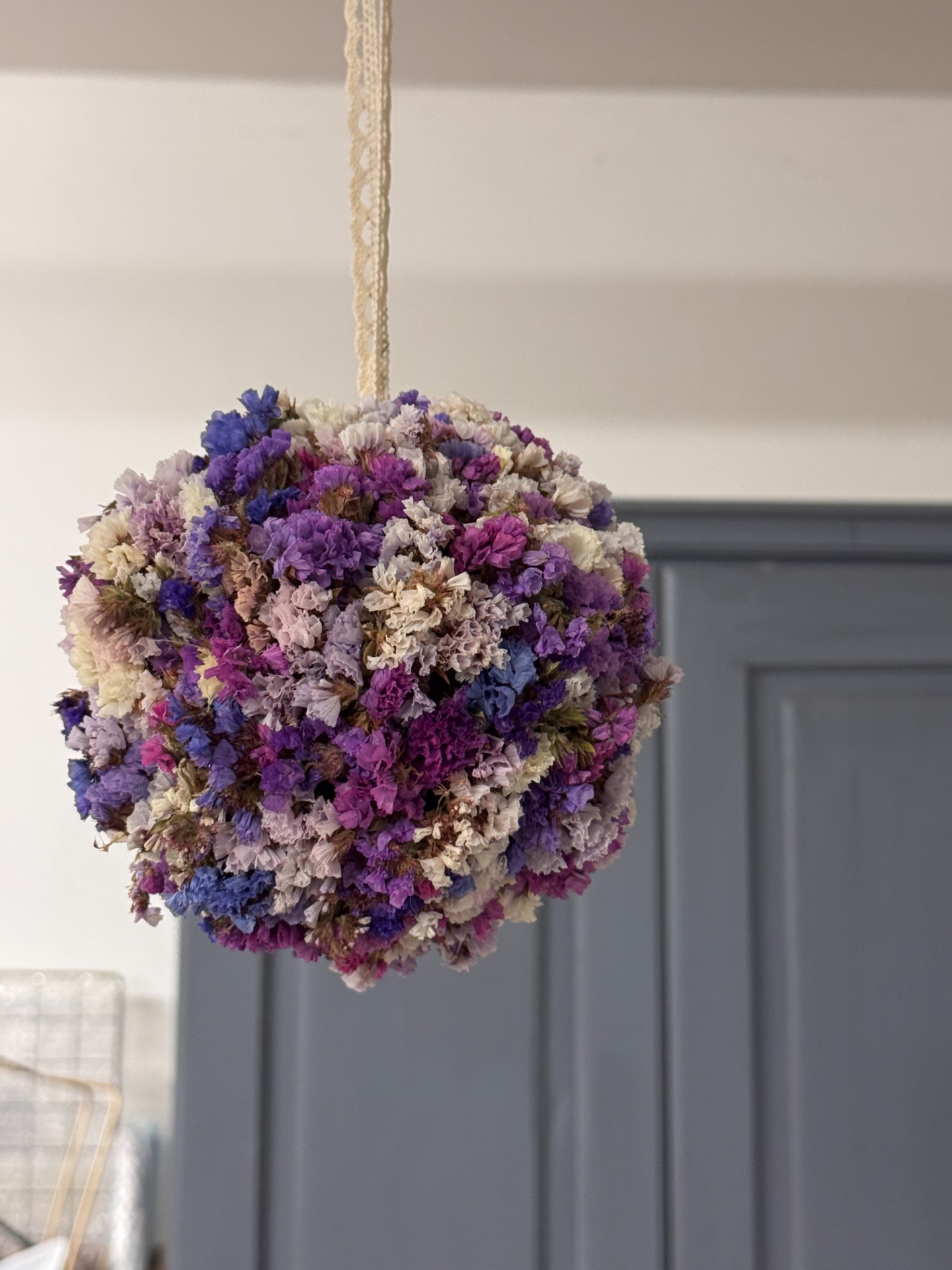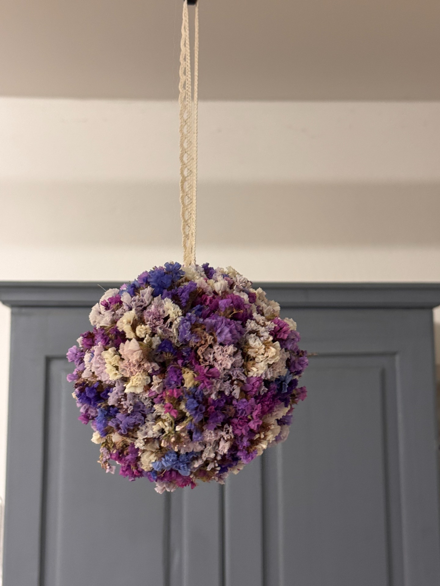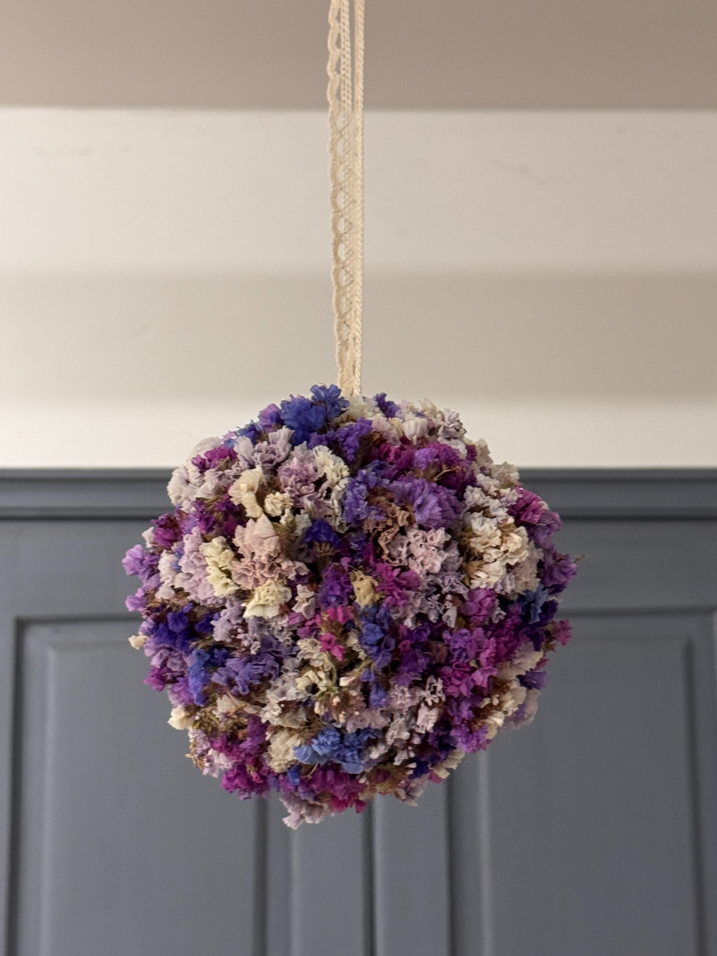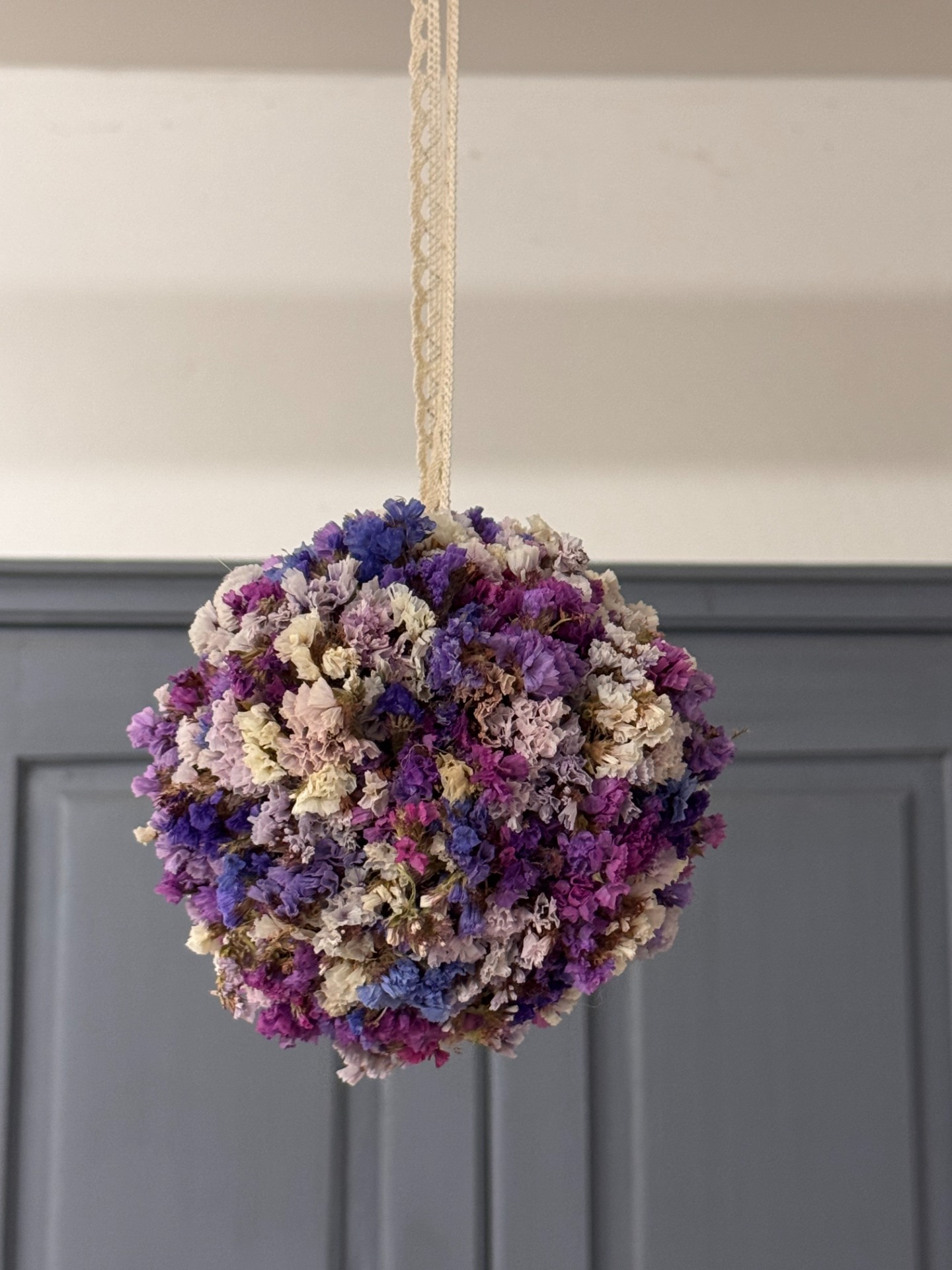 Květinová koule ze sušené statice v odstínech fialové, růžové a krémové. Působí romanticky a klidně, jako dotek levandulového pole plného slunce a vůně. Vhodná k zavěšení do interiéru nebo pergoly.