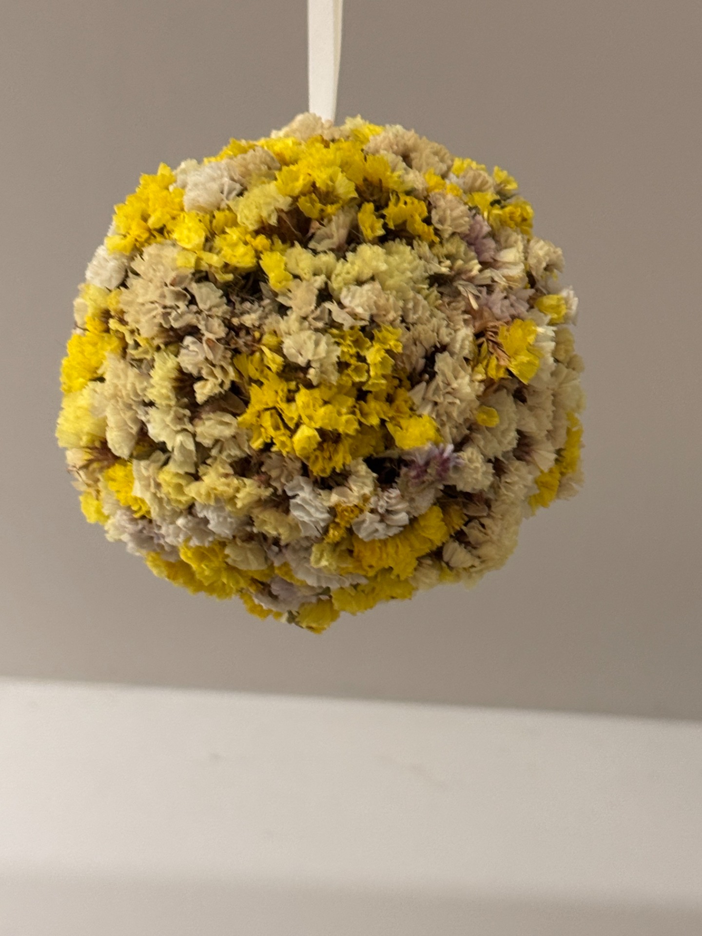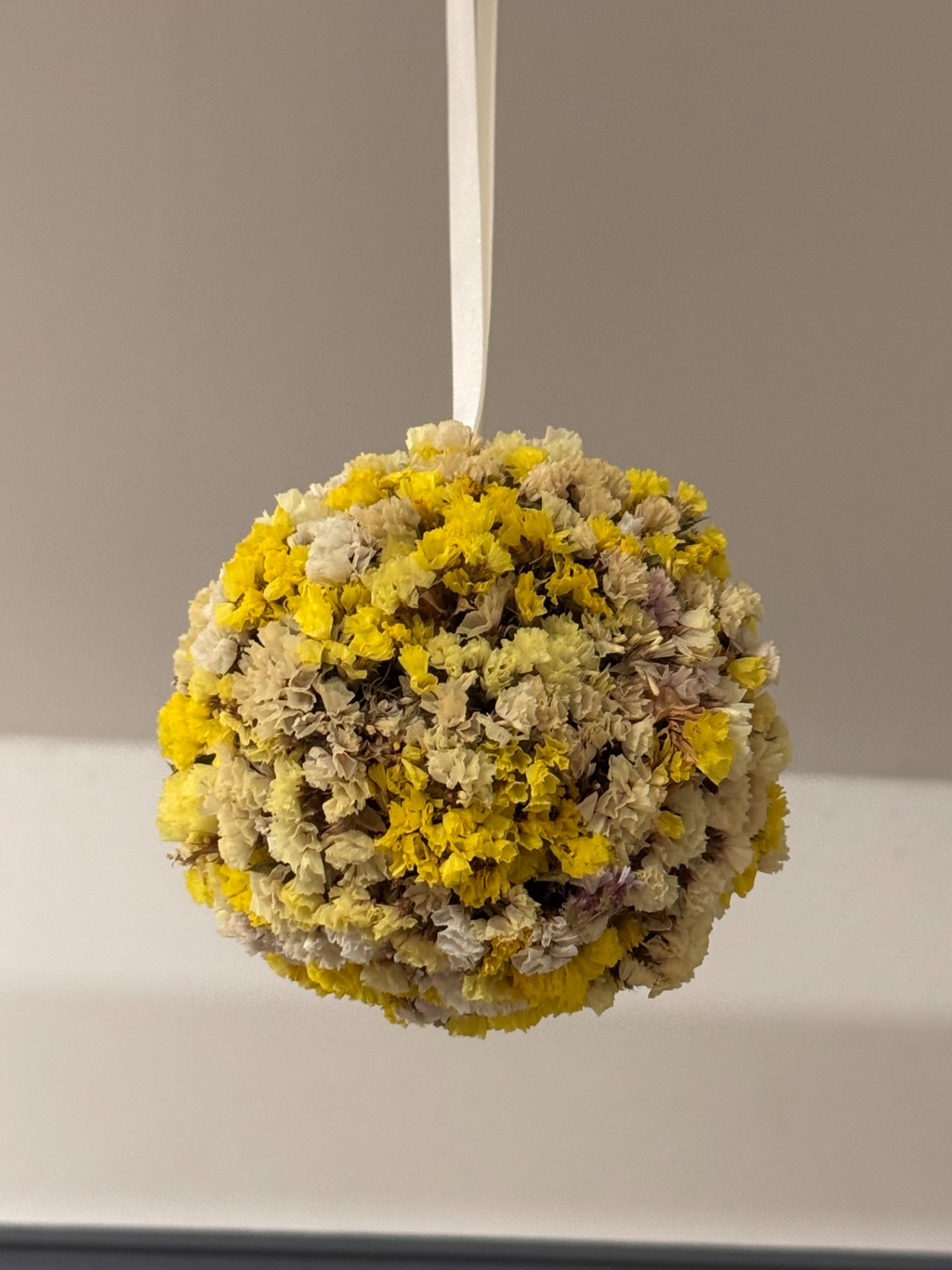 Originální koule ze sušené statice v odstínech žluté, krémové a smetanové. Symbol tepla, radosti a světla, který vnáší do prostoru pozitivní energii a klid. Jako dekorace k zavěšení na saténové stuze.