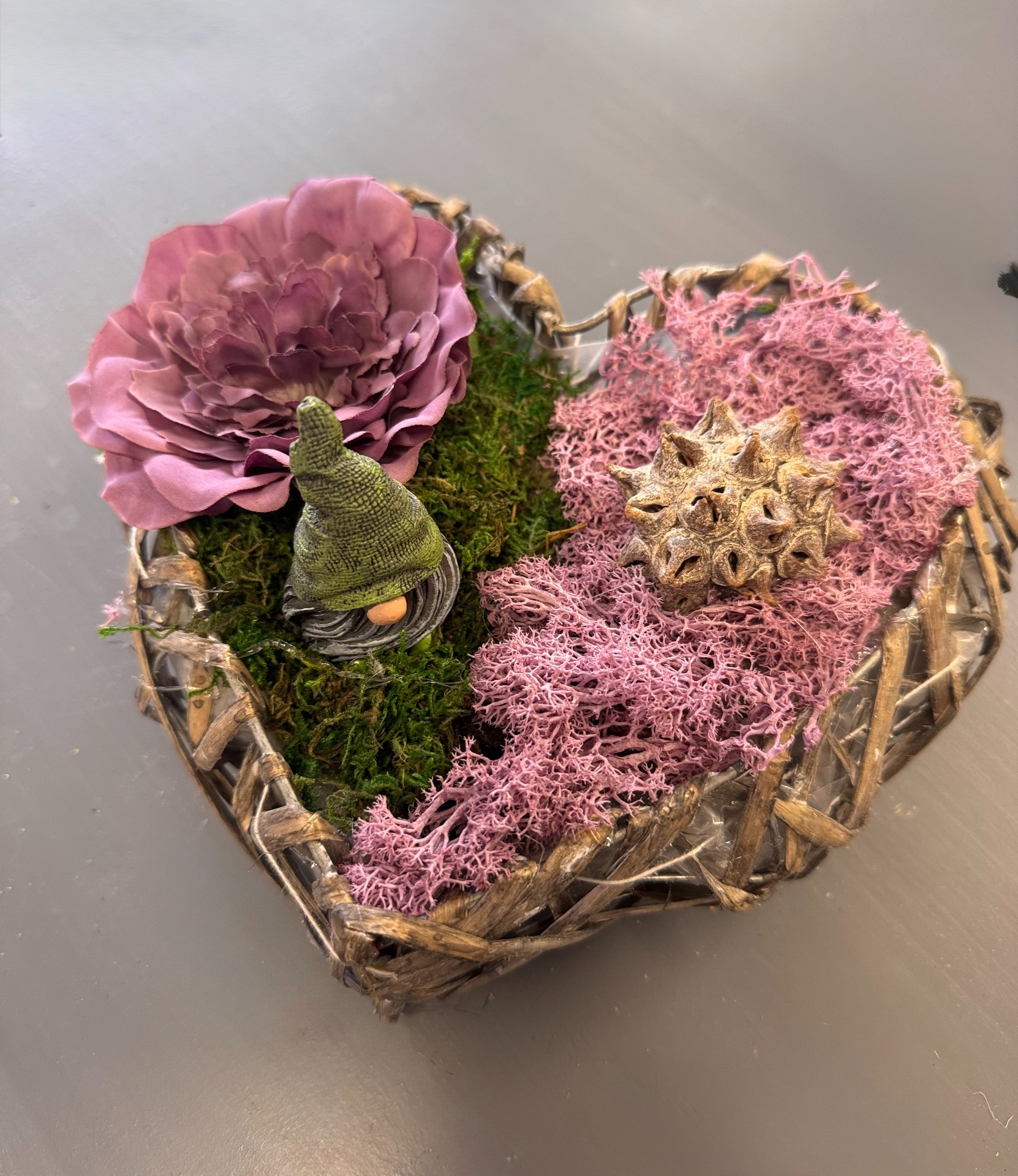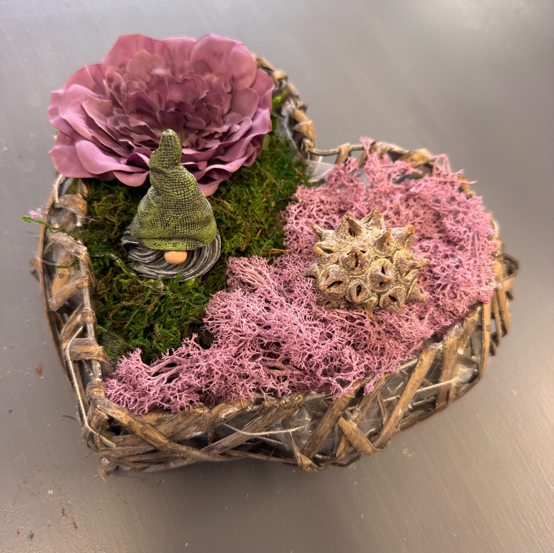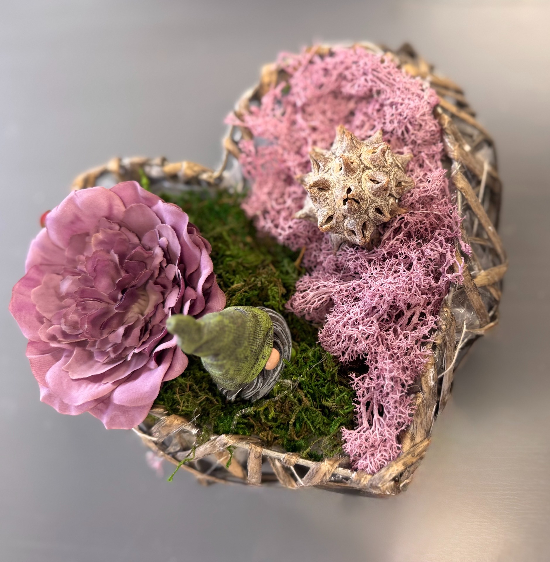 Proutěné srdce se stabilizovaným mechem, růžovým lišejníkem a jemnými přírodními doplňky. Symbol lásky, ticha a vděku, doplněný drobným skřítkem, který stráží vzpomínky. Vhodné jako drobná dušičková dekorace, dárek nebo památeční ozdoba pro ty, na které nechceme zapomenout.