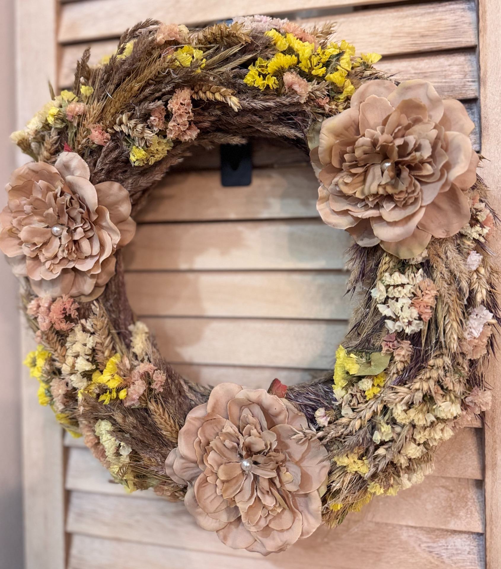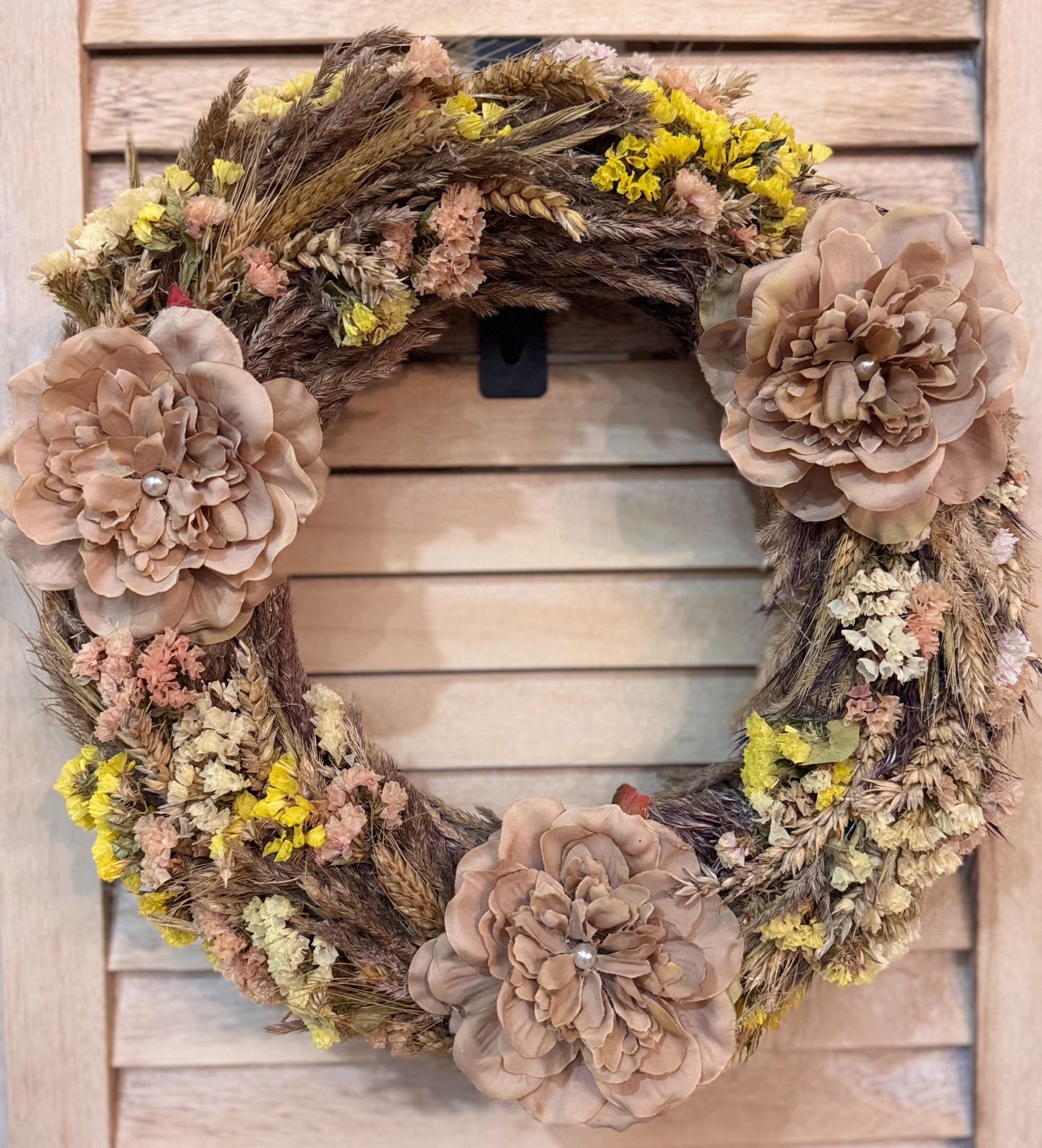 Tento ručně vázaný věnec kombinuje klasy pšenice, sušené kvítky a velké textilní květy v tónech béžové, pudrové a zlaté. Jemné barvy a přirozená struktura sušenin vytvářejí hřejivý a nadčasový dojem - ideální pro domov laděný do přírodního nebo boho stylu.