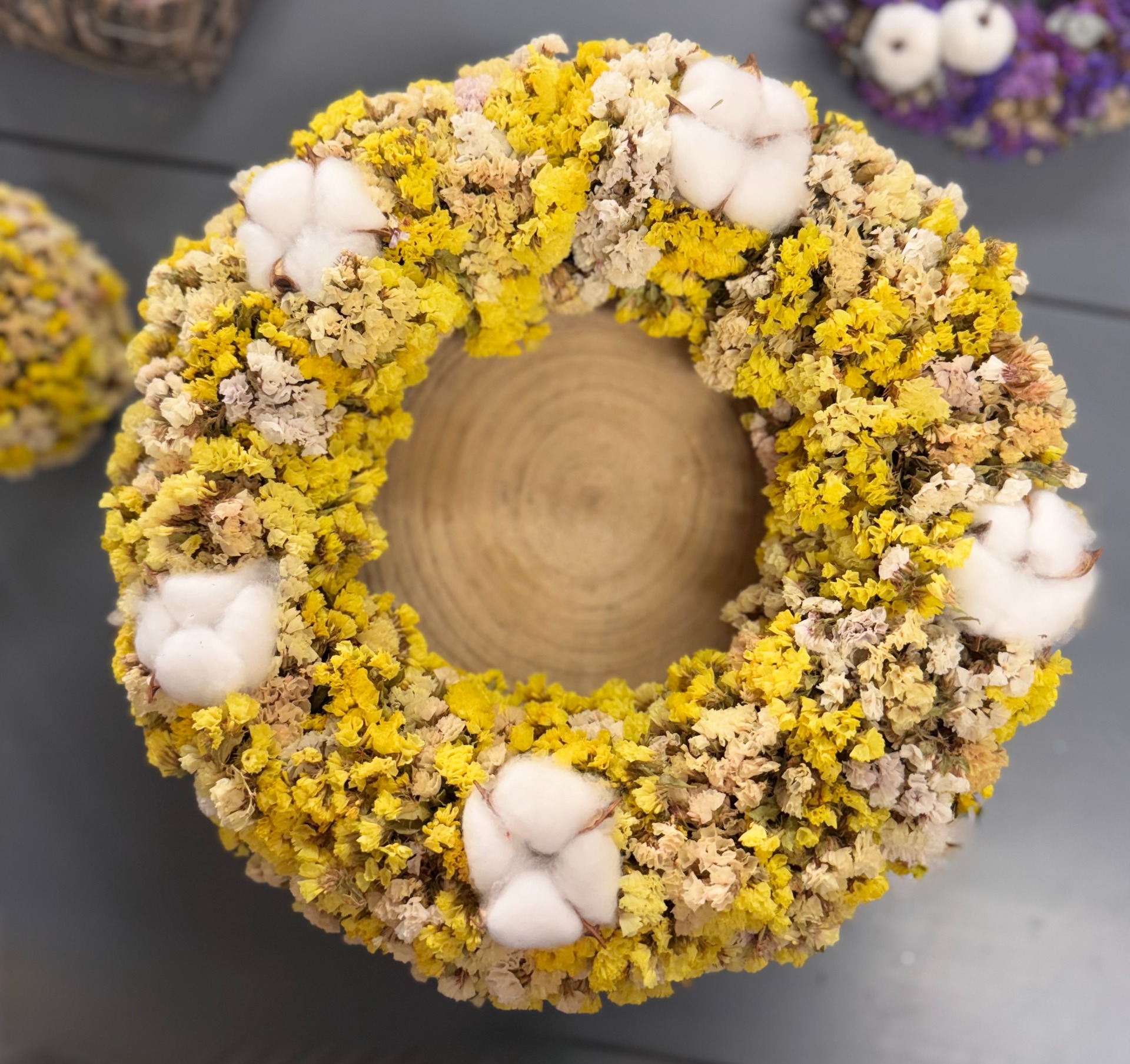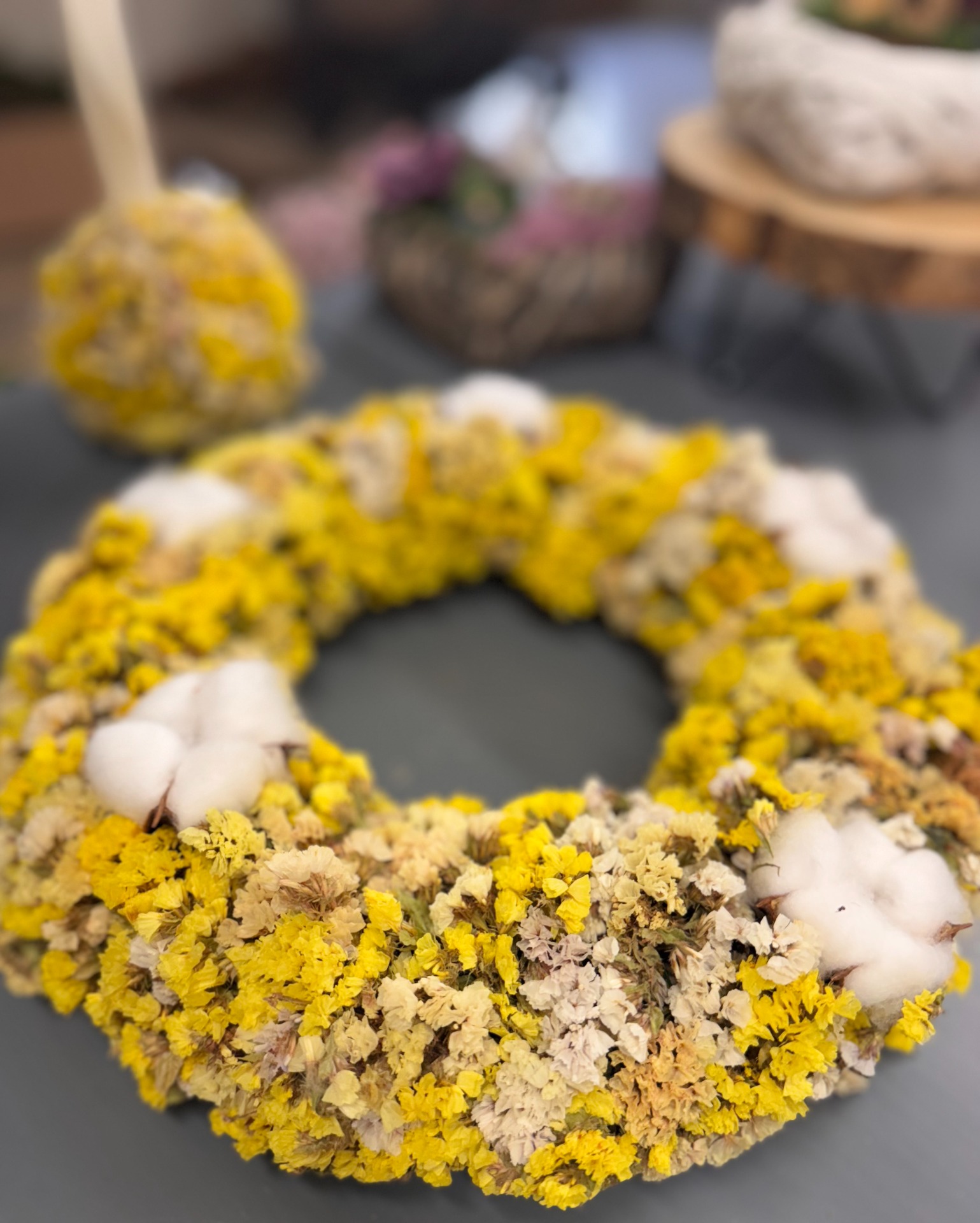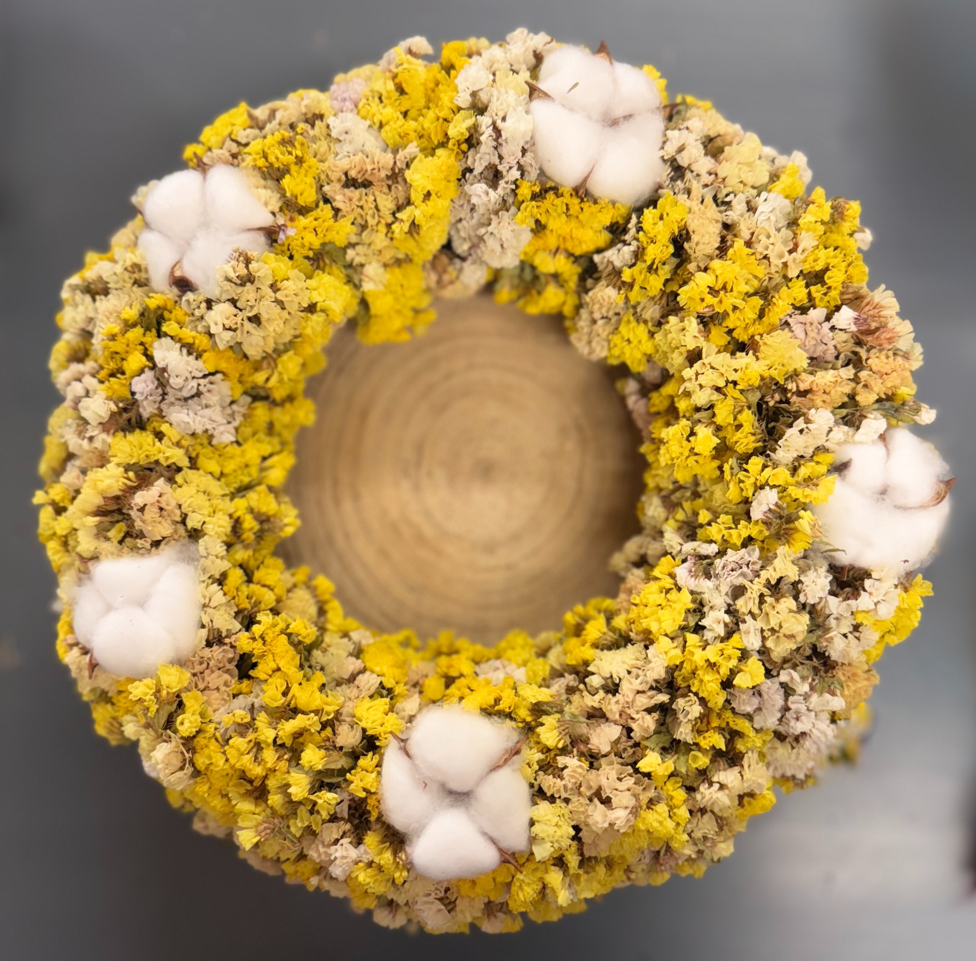 Velky věnec ze sušené statice v odstínech slunečně žluté, doplněný o syntetickou bavlnu. Jemná a optimistická kombinace, která symbolizuje světlo, klid a vděčnost.