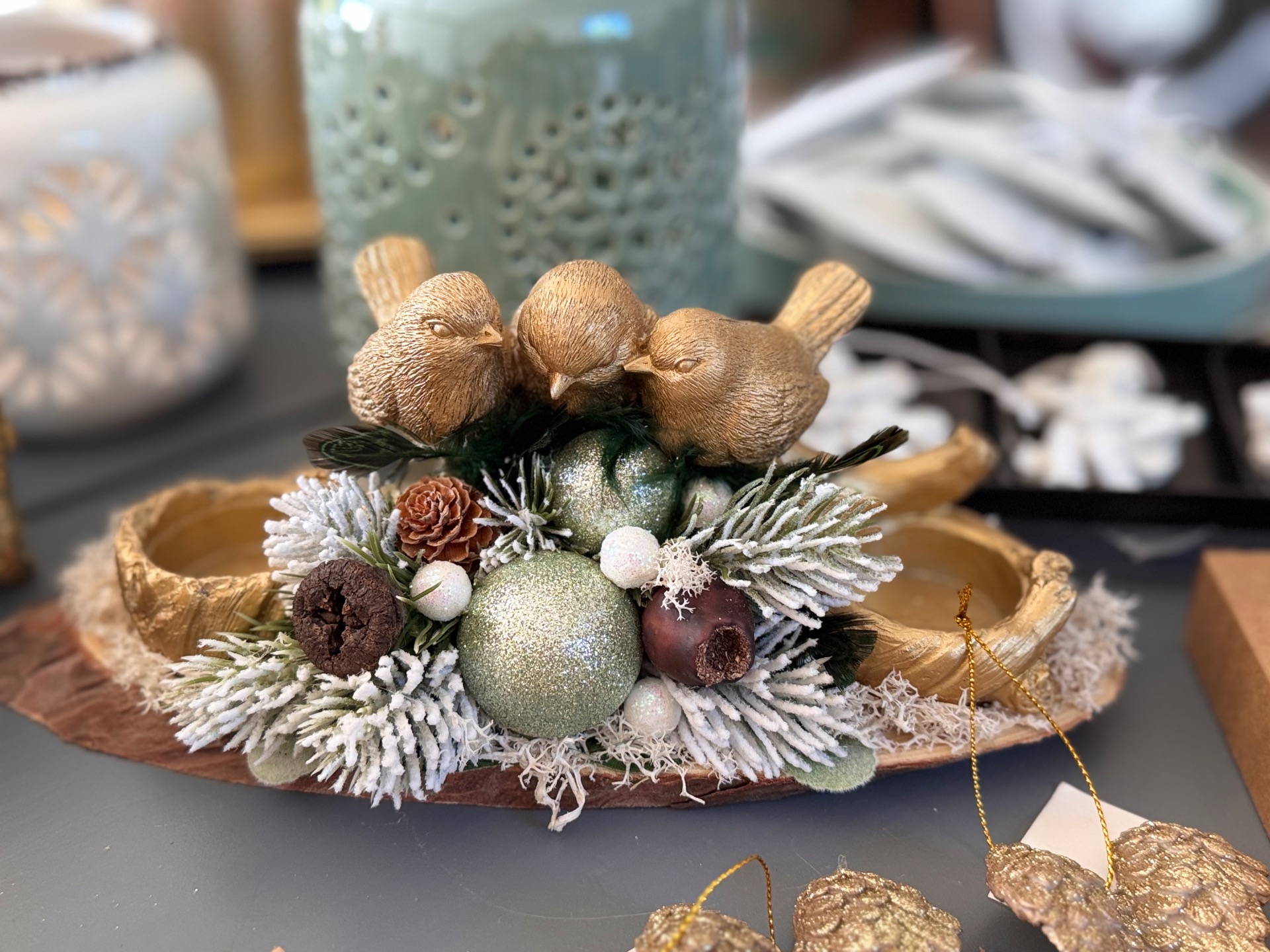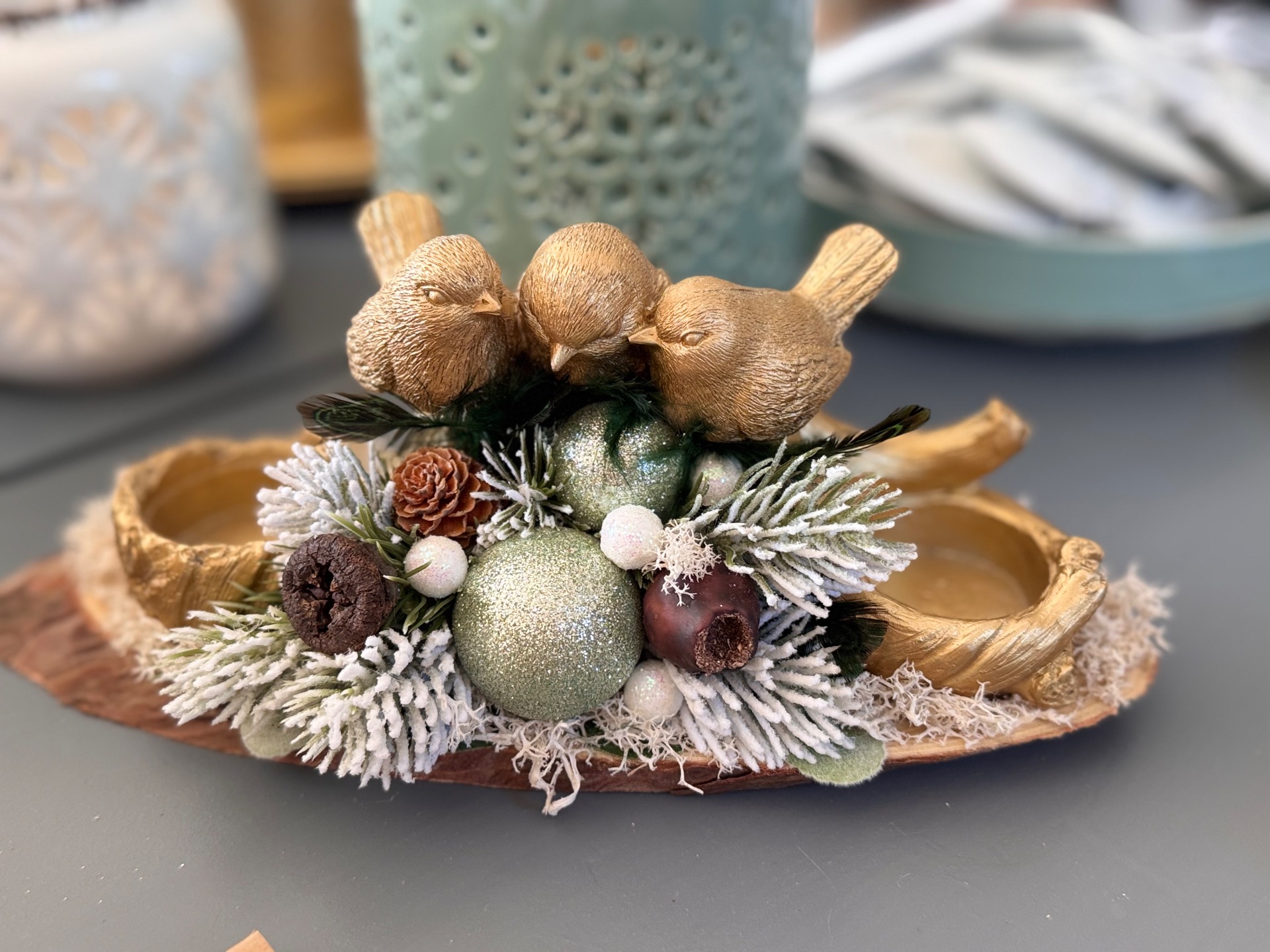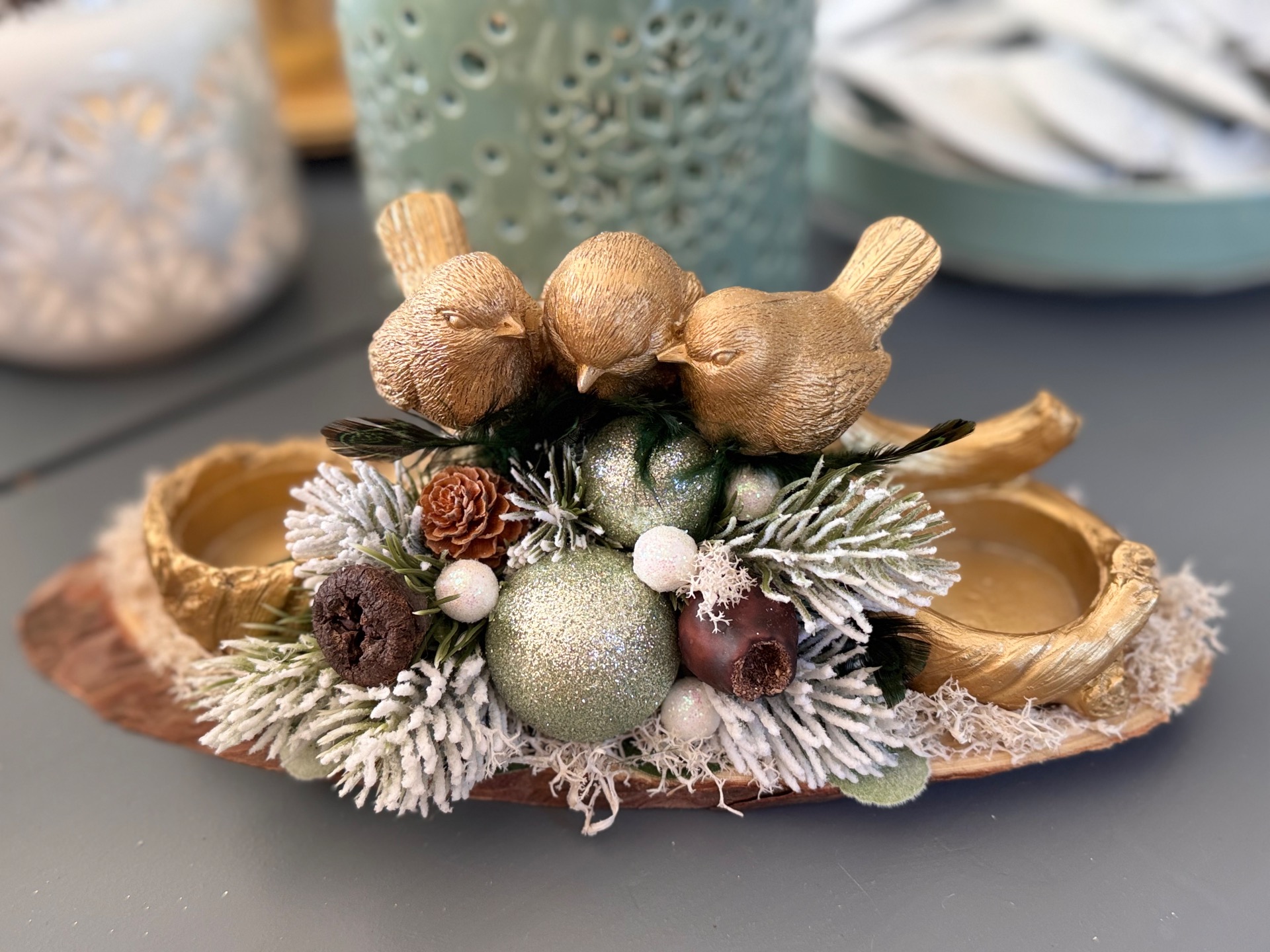 Na dřevěném podstavci odpočívají tři zlatí ptáčci obklopení jemnými zasněženými větvičkami, třpytivými ozdobami a přírodními plody. Celek působí klidně, útulně a vnáší do interiéru kouzelnou atmosféru Vánoc.